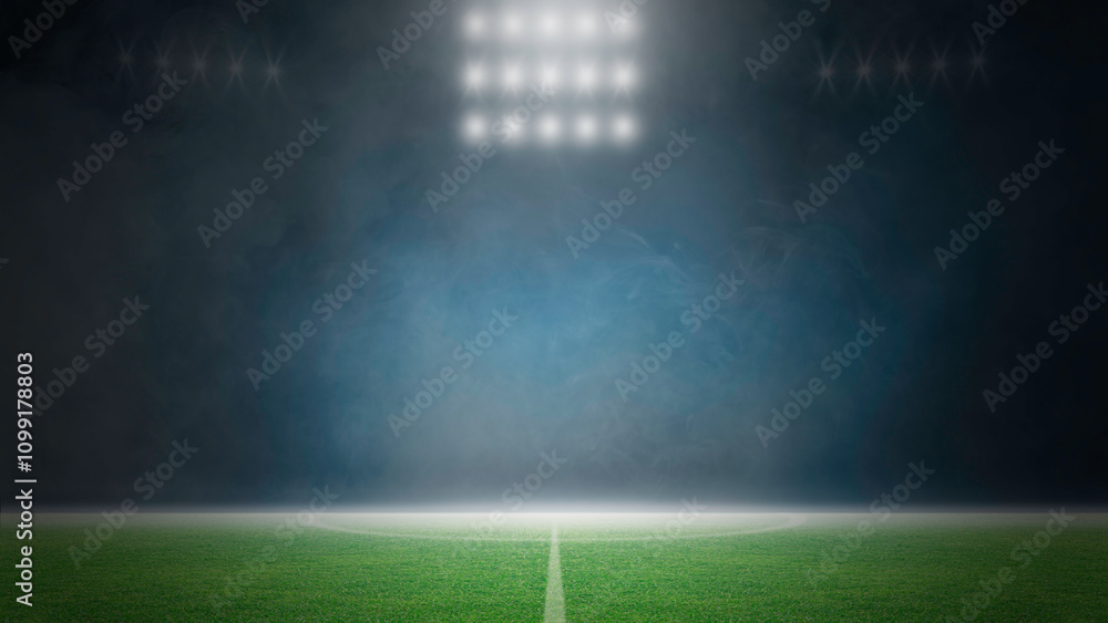 Green grass field sports stadium, Dark scene stage lights concert, spotlights and smoke floating up, night view for display soccer game of sport, competition, and entertainment