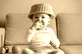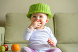 Cheerful baby girl plays with dish and fruit at home