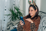 young woman using mobile phone at home on christmas