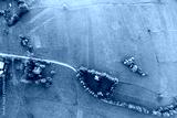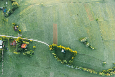 Aerial View of Rural Green Fields and Houses