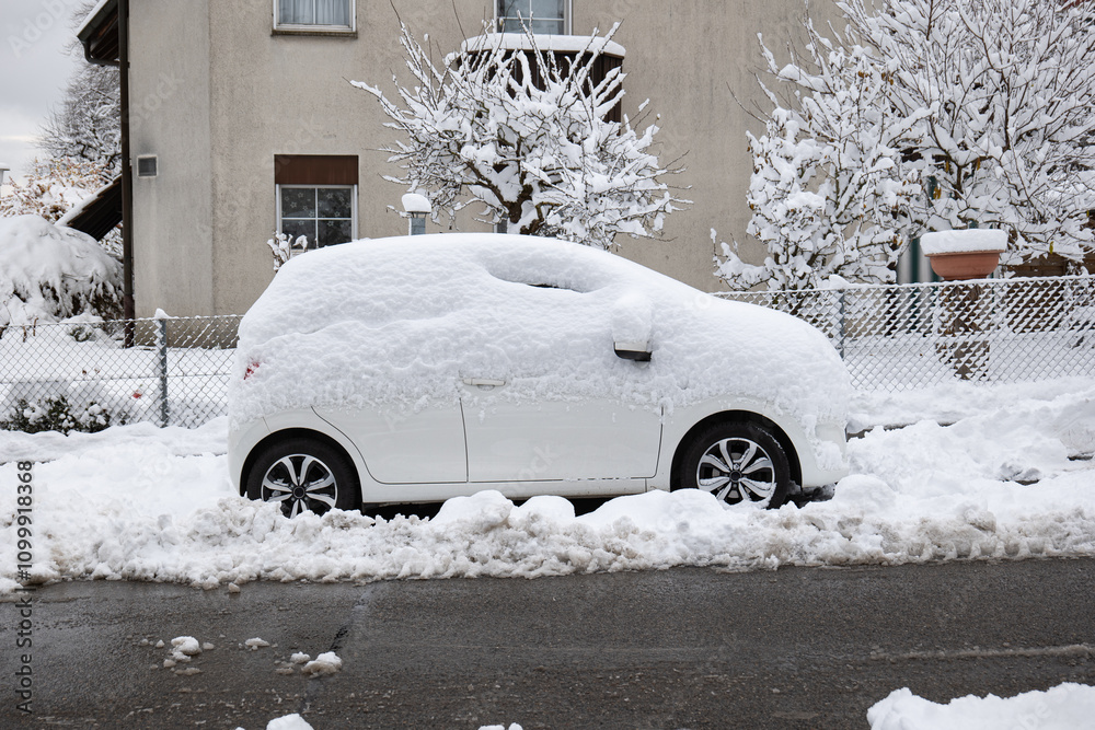 Snow covered generic small white hatchback car parked in the street after heavy snowfall. Close up wide angle view, no people