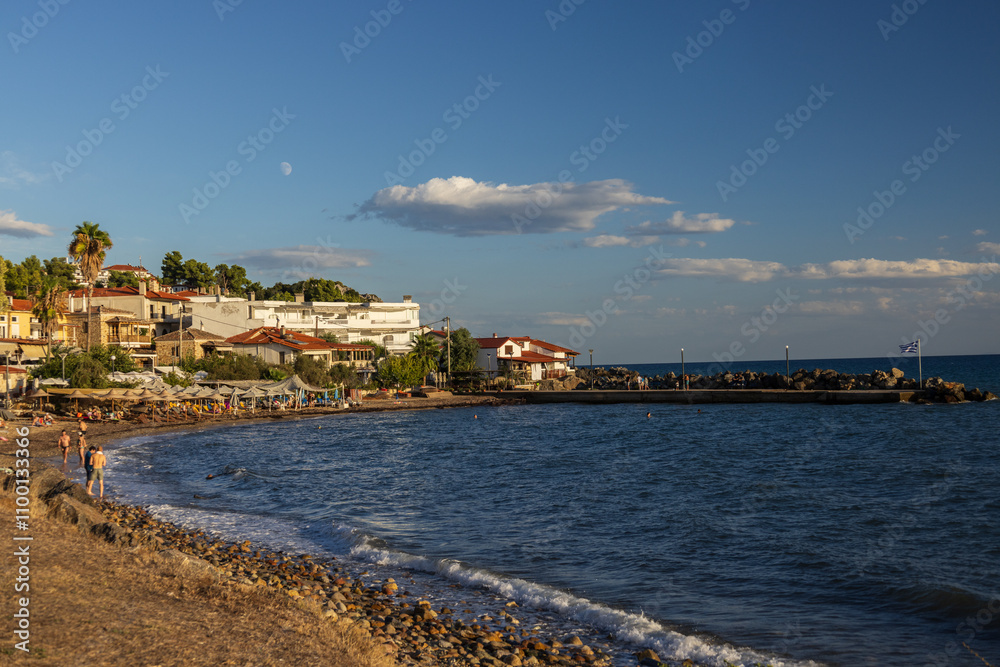 Charming coastal village with a clear blue sky above and a serene beach line, embodying tranquillity and leisure, under warm evening light with distant horizon visible with Moon