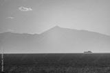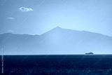 A breathtaking view of a ship silhouetted against a misty sunset, with a mountain peak emerging softly in the background, creating a serene and tranquil atmosphere.