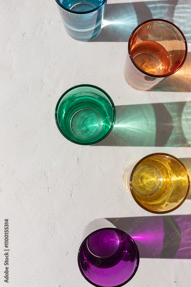 Transparent colorful glasses with sun shadows on harsh light on the white concrete background