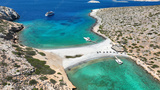 Aerial drone photo of paradise two sided sandy bay with crystal clear emerald sea in tropical exotic destination island