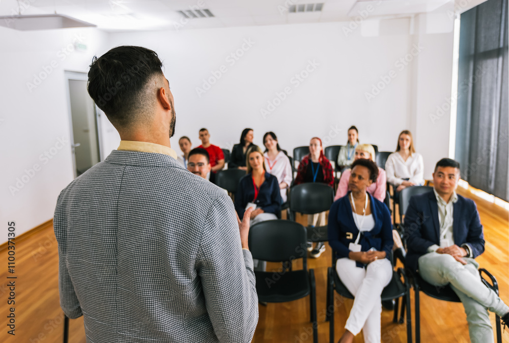 Male CEO standing in front of a multiracial group of colleagues. Multimedia classroom with smart board and graphics on them.