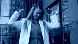 Happy successful woman Caucasian businesswoman winner excited girl student celebrating victory rejoicing at achievement dancing in city outdoors winning good news great result achieve business success