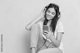 Woman listening music in headphones and using smartphone