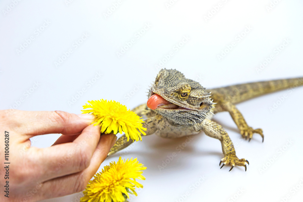 Agama lizard is feeding by a yellow flower dandelions. Agama fires tongue toward a dandelion.. Everything is on a light background.