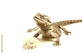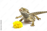 Agama lizard is standing on the light background. The yellow blossom of dandelion is lying in front of her. Agama has head held high and slightly tongue out. Everything is on a light background.
