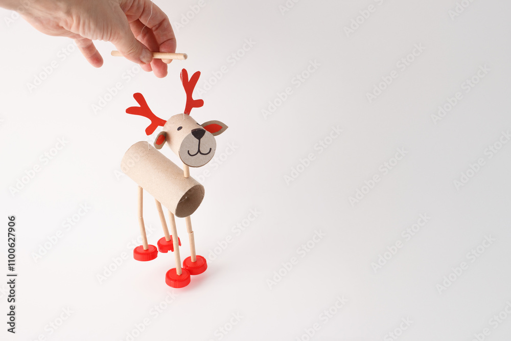 DIY reindeer puppet made from cardboard tubes, red plastic caps, and paper details. Studio shot on white background. Christmas craft and holiday decoration concept. Fun recycled project for kids