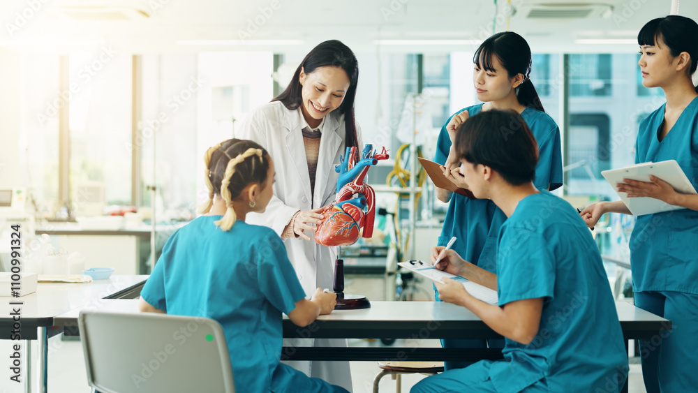 Learning, professor and students with heart in hospital for lesson, education or practical training. People, study and healthcare group with mentor in cardiology with human model at college in Japan.