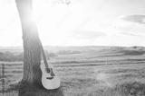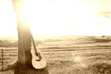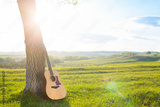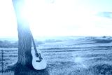 classical guitar propped against a tree trunk