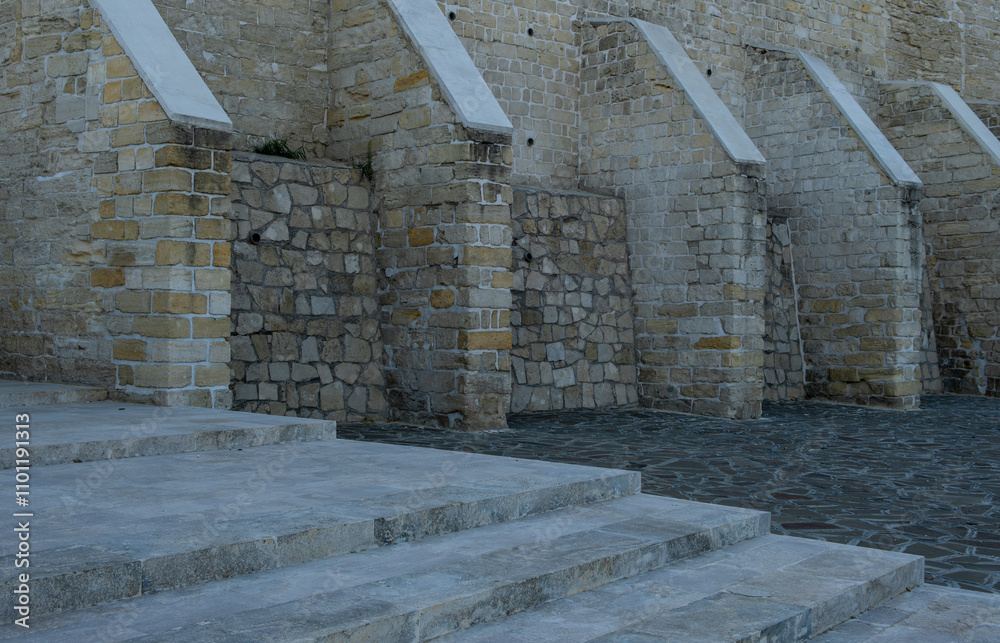 Reinforced stone wall with facets.