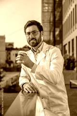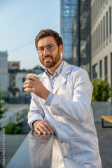 Ginger good-looking doctor having coffee in the morning and looking contented