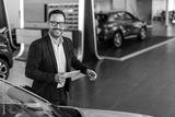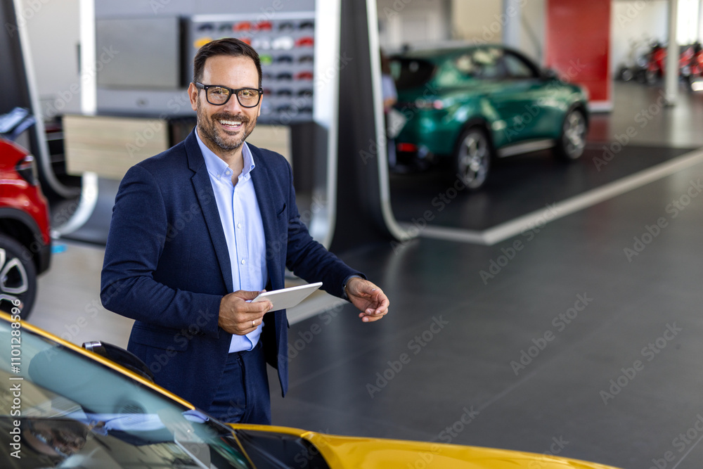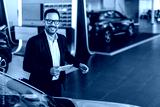 Successful deal in a car showroom. Handsome male car salesman working in the showroom. Salesperson at car dealership selling vehicles.