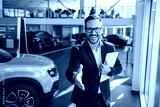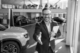 Successful deal in a car showroom, young confident sales man reaching out for a handshake.
