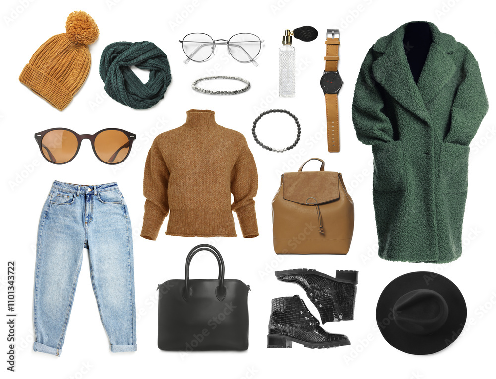 Stylish winter or fall outfit. Women's clothes and accessories, collection on white background. Fashion trend board