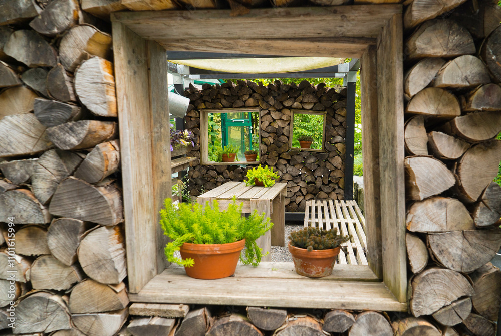 A unique view through a wooden wall with a small window framing potted plants, highlighting the rustic charm and simplicity of nature’s connection.