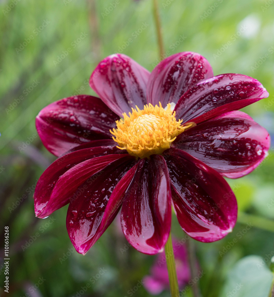 A striking purple-red flower with a yellow center is artistically gleaming with raindrops, set against lush green foliage, capturing nature's vivid artistry.