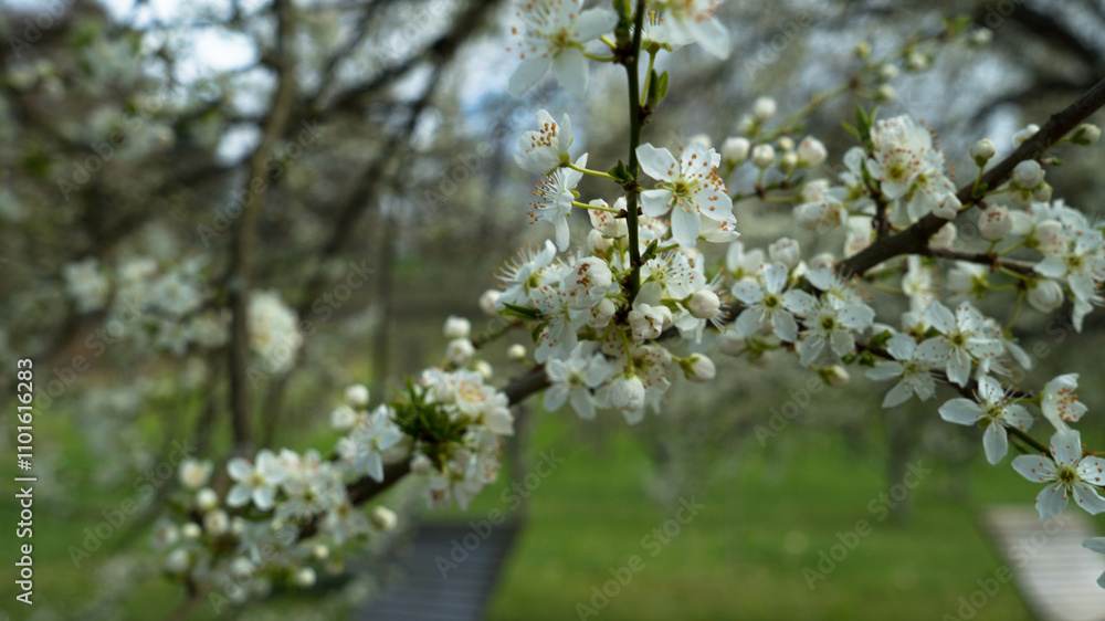 White blossoms adorn a tree branch, gently swaying, evoking a sense of purity and peace in their delicate, intricate design against a blurred background.