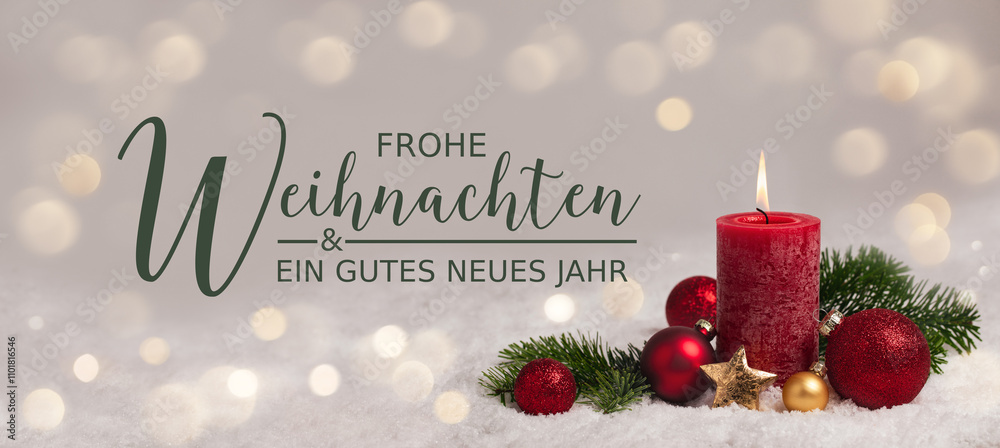 Christmas Greeting Card - Merry Christmas German text, Red Candle in winter snow landscape background - Xmas background with magic golden bokeh lights, Advent Candle Panorama