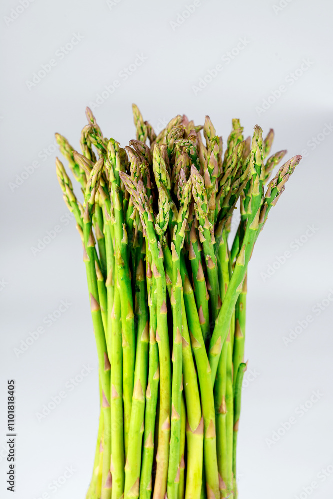 Vibrant bundle of fresh asparagus stands upright against neutral background, showcasing green stalks and delicate tips, perfect for culinary dishes or health-conscious meals.