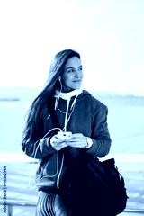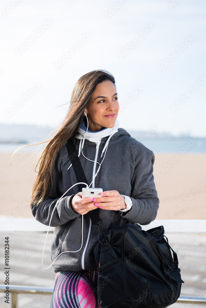 Fitness female athlete using her smartphone. Sporty urban woman in pink pattern leggings listening music.