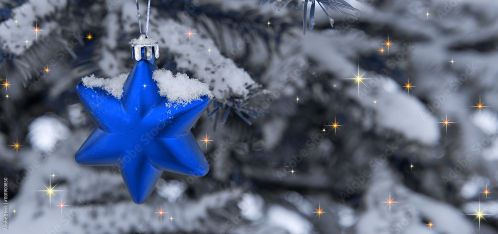 Blue star on snow covered pine branch .Christmas background.