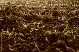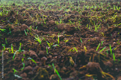 New fresh green sprouts on agricultural field. Dark brown moisturized soil with healthy crop growing.