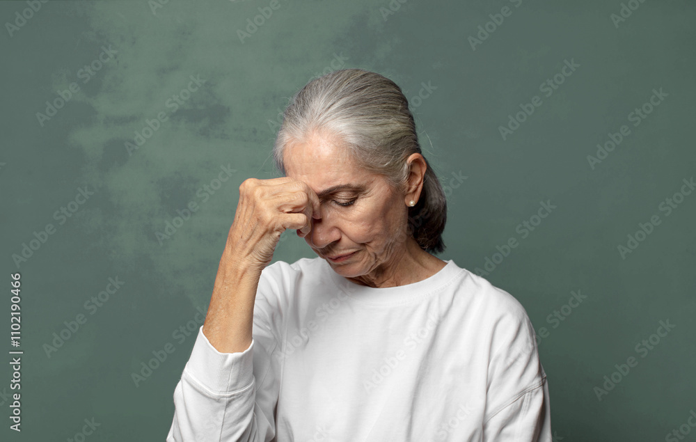 feeling stressed, unhappy and frustrated, touching forehead and suffering migraine of severe headache