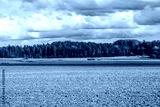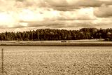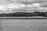 Expansive farmland with plowed fields, green pastures, and tractor working under cloudy sky near forest edge. Sweden.