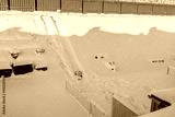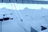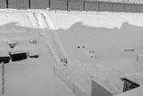 Freshly fallen snow in backyard with sled tracks leading down hill, bordered by wooden fence and garden beds. Sweden.