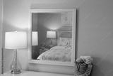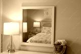 Cozy kids bedroom with a pastel-themed bed reflected in a white-framed mirror, featuring soft lighting, playful decor, and a woven basket with plush toys.