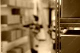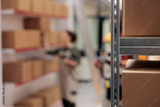Selective focus of metallic shelves full with carton boxes, in background storehouse workers preparing customers orders. Storage room employees managing parcels transportation, working in warehouse