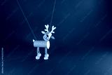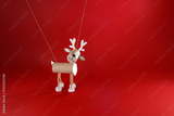Handmade reindeer marionette toy made of cardboard or recycle empty toilet paper roll tube on a red background. Studio photography. Christmas craft and holiday decoration concept
