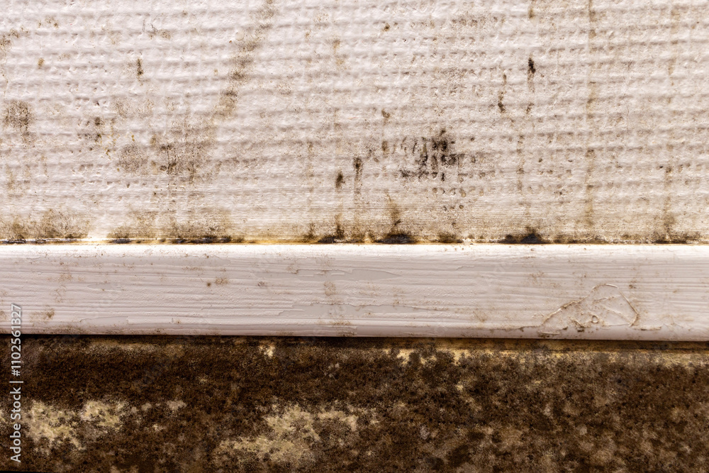 severe black mold and mildew growth on baseboard and textured wallpaper near floor. Indoor hygiene issue and moisture problem concept for health awareness and repair design.