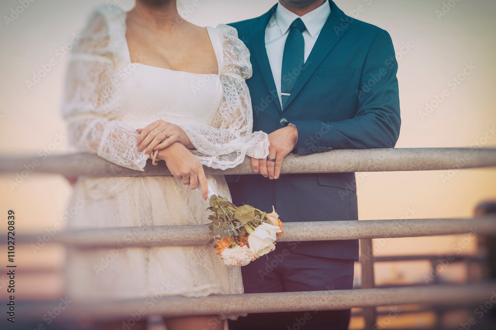 Close up of a n unidentifiable couple standing a a railing wearing formal attire in late afternoon light with a diffused effect The woman is holding a bouquet of flowers