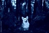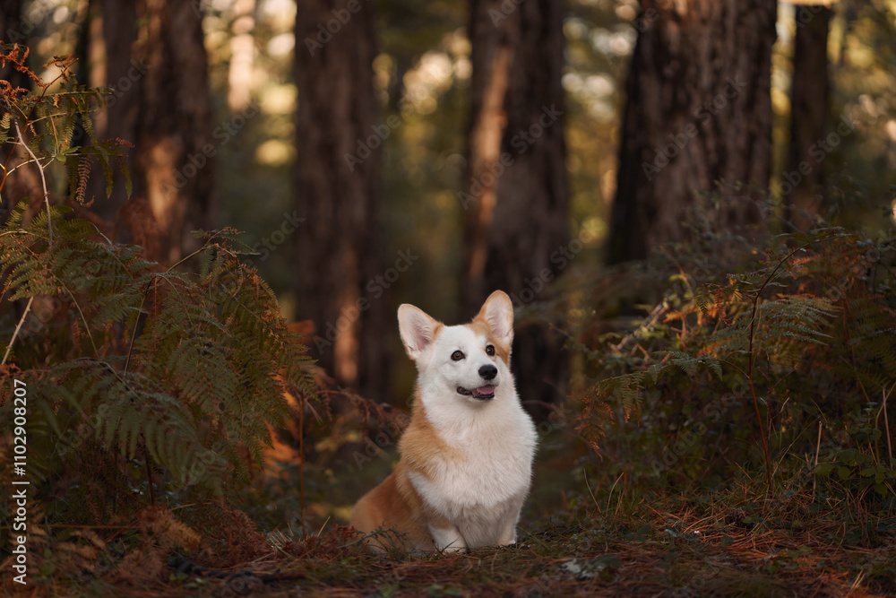 A Pembroke Welsh Corgi lies peacefully amidst ferns in a sun-dappled forest clearing. The relaxed posture of the dog harmonizes with the tranquil and vibrant autumn setting.
