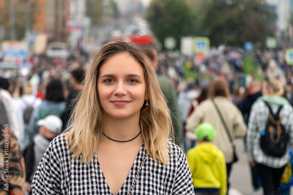 A woman goes against the movement of the crowd during the day in a big city. girl alone in the front of the crowd on the other side of the road.