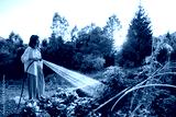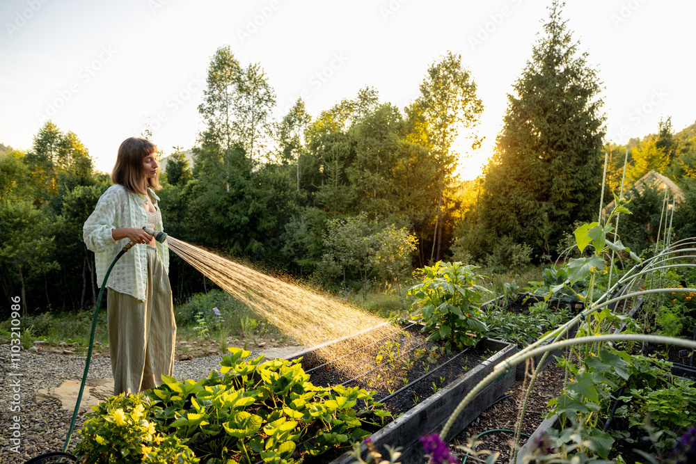 A woman waters her garden in the early morning, surrounded by lush greenery and a stunning mountain view. The peaceful moment captures the essence of life in harmony with nature
