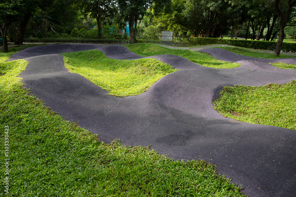 Black ethylene-propylene diene (EPDM) rubber track in the park. Balance bike lane for children.