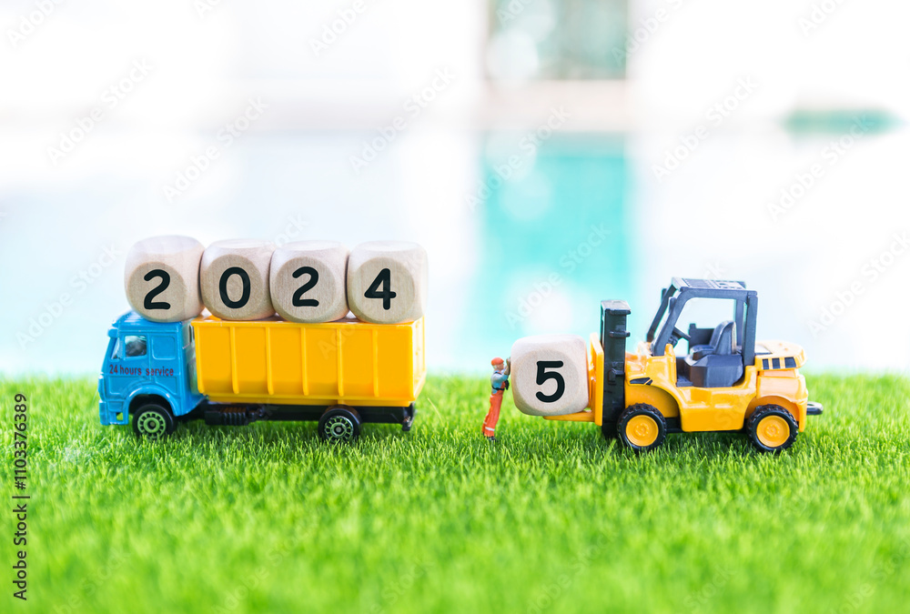 Good bye 2024 welcome 2025, wooden cube on forklift truck and service truck on green grass over blurred background