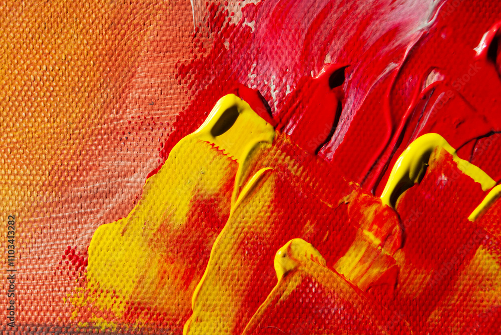 Bold red and yellow acrylic paint layered thickly on canvas, forming a vibrant and textured artistic background.
