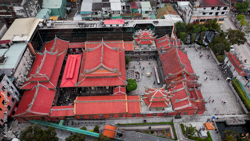 Temple complex in Taipei featuring traditional architecture and lively surroundings
