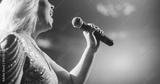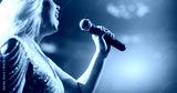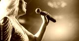 Close Up Portrait of a Blonde Musician Using a Microphone to Sing a Powerful Pop Song in a Beautiful Warm Lit Venue. Female Music Performer Putting On a Show at a Concert Stage