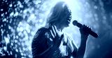 Portrait of a Blonde Pop or Rock Musician Holding a Microphone to Sing a Powerful Hit Song in a Beautiful Warm Lit Venue. Female Music Performer Putting On a Live Show at a Concert Stage