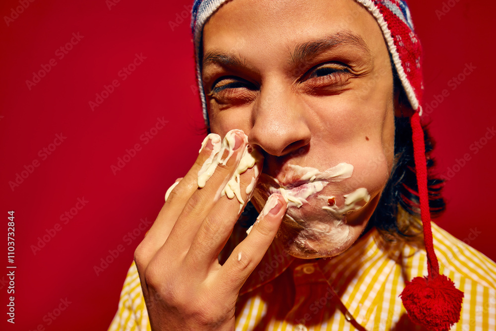Delicious messy bite. Young man in winter hat, with face covered in mayonnaise sauce, eating delicious sausage, Bratwurst against bright yellow background. Concept of street food, winter, pop art