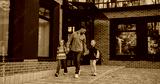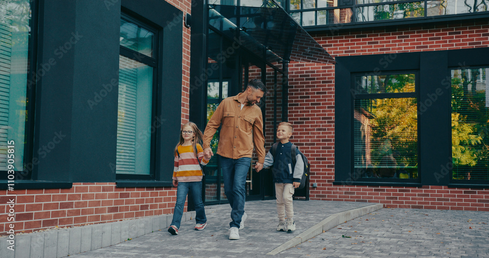Front camera view of handsome Caucasian father walking away from school together with his charming children. Everyone smiling. Going back home after studying. Warm autumn weather. Carrying backpacks.