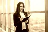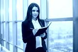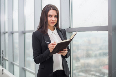 Business woman with notebook is window in office